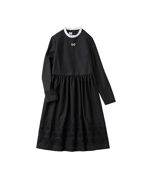 上品さのある裾に花柄レースの入ったワンピースは、子供の新たなる門出にぴったり。濃紺一色、胸元のシンプルなリボンが清楚なイメージを引き立たせます。卒業式や発表会におすすめ。