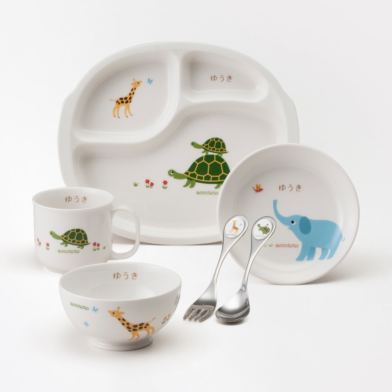 ランチプレートやお茶碗、マグやカトラリーまで全6点がセットになっている「はじめてごはんセット」。子どもたちが大好きな動物がプリントされていて、まるで絵本を眺めているかのような楽しい気分になれそう。
