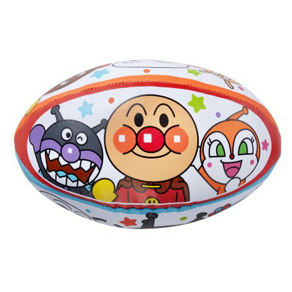 アンパンマンに出てくるキャラクターがたくさんついたラグビーボール。やわらかく、カラフルでポップなボールです。